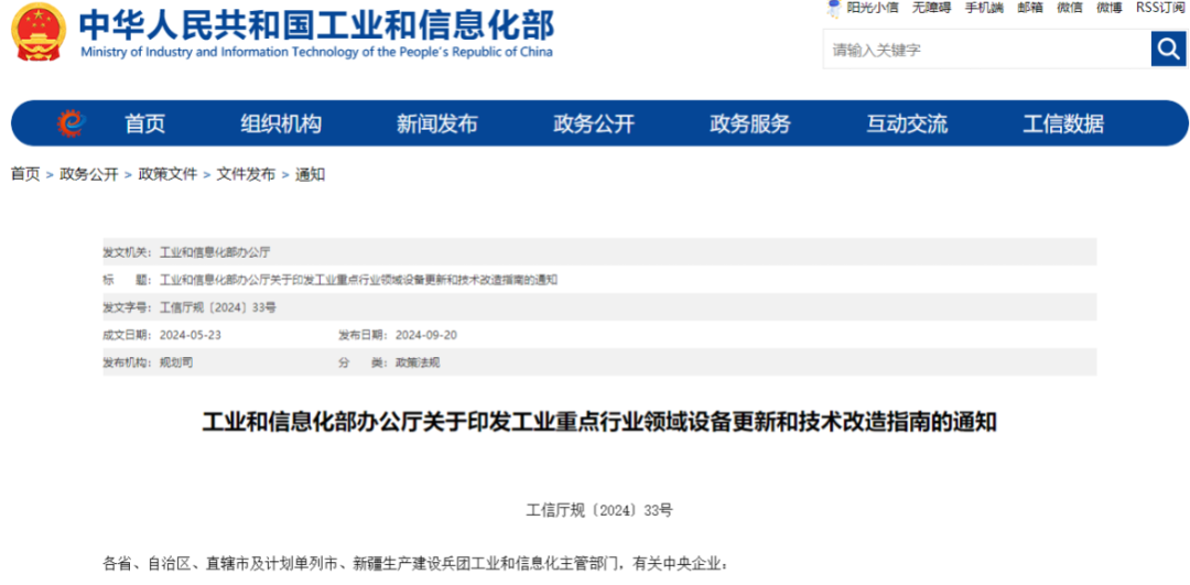 日前消息,为贯彻落实党中央、国务院决策部署,加强对推动工业领域设备更新和技术改造工作的指导,依据《大规模设备更新和消费品以旧换新行动方案》和《推动工业领域设备更新实施方案》,工业和信息化部组织编制了《工业重点行业领域设备更新和技术改造指南》。
