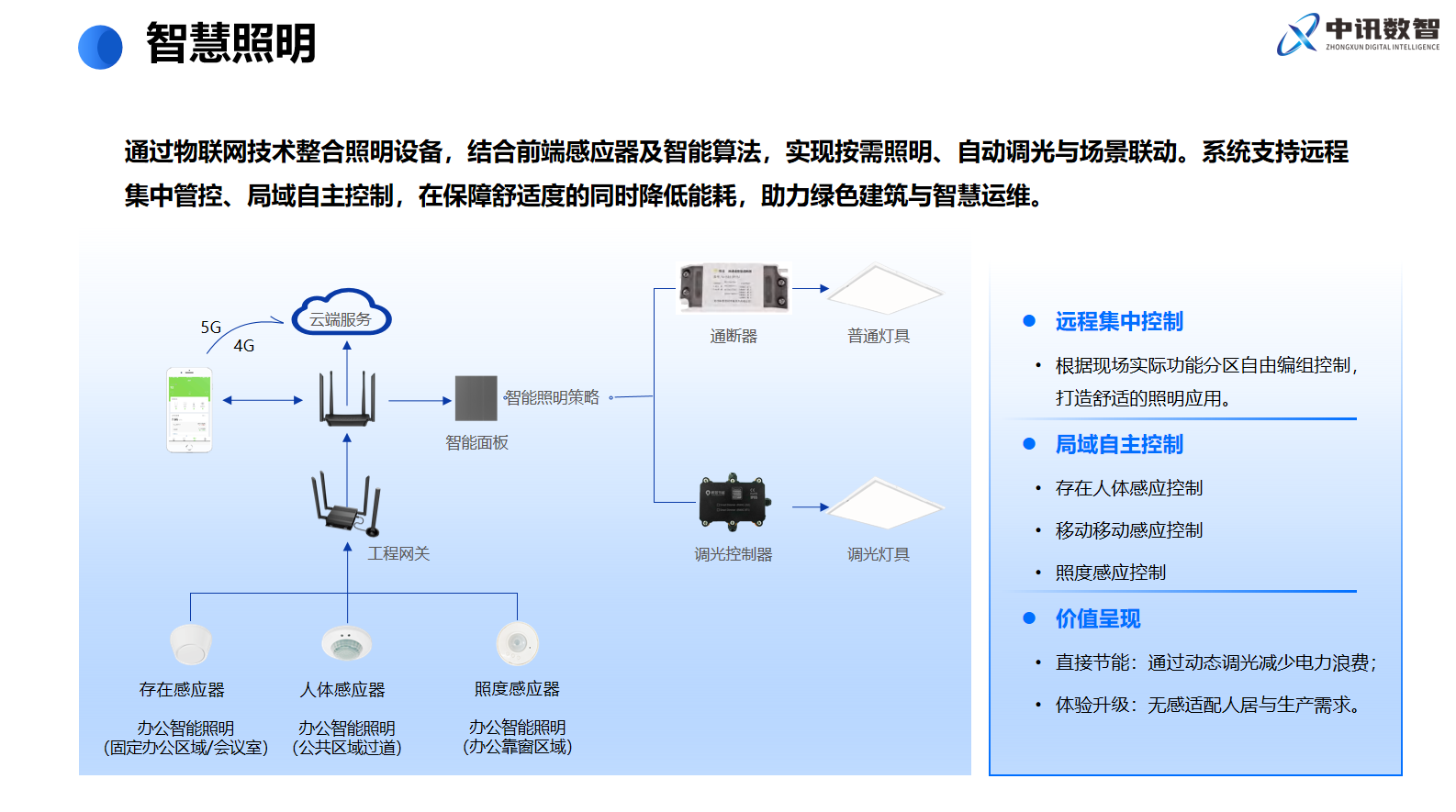 智慧照明远程集中控制根据现场实际功能分区自由编组控制,打造舒适的照明应用。局域自主控制存在人体感应控制、移动移动感应控制、照度感应控制价值呈现直接节能:通过动态调光减少电力浪费;体验升级:无感适配人居与生产需求。