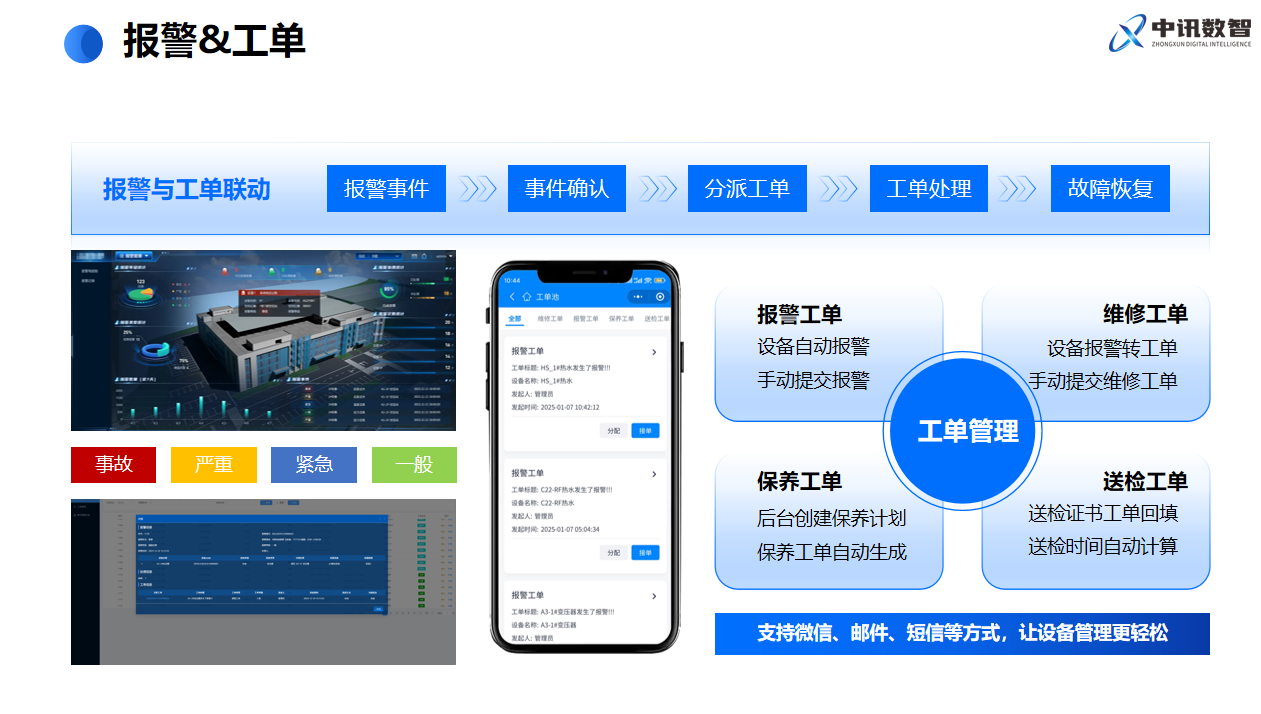移动端闭环:工单直推手机,谁处理、做什么一目了然。接单到反馈全程在线。